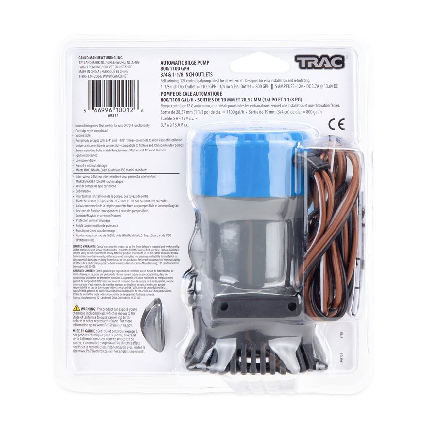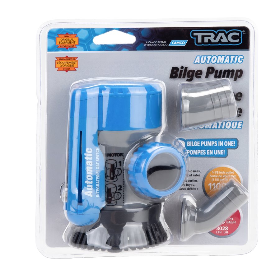 Pompa zęzowa TRAC Auto 800/1100 GPH Automatyczna pompa zęzowa do stosowania na łodziach. Pompa – dane techniczne: