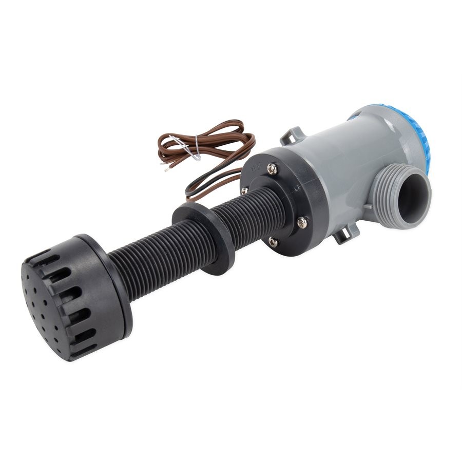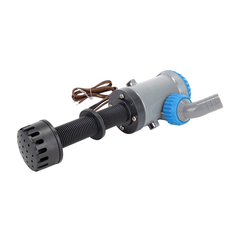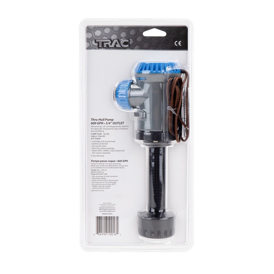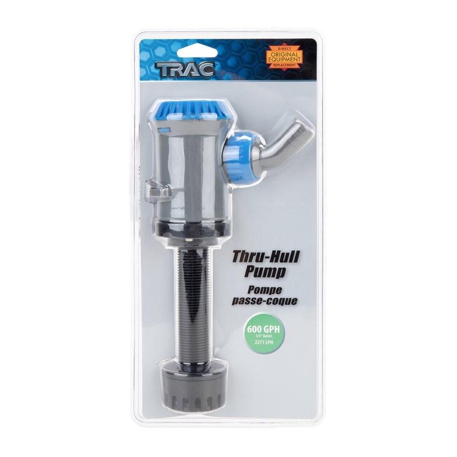 Pompa wody zaburtowej TRAC 600 GPH Pompa do montażu poziomego lub pionowego pod lustrem wody. Służy do zasilania zbiorników w wodę zaburtową. Można również stosować do wypompowania wody ze zbiornika na zewnątrz. Często jest stosowana do napełniania i opróżniania zbiorników na żywca. Pompa jest zakończone nagwintowaną plastikową rurą o długości 12cm. Podczas montażu rurę należy dociąć na żądaną długość i zakończyć filtrem z zestawu. Pompa – dane techniczne: